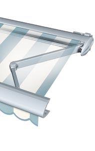 Die Gelenkarme sind mit einer Flexbandumlenkung ausgestattet. Die Markise ist standardmäßig komplett pulverbeschichtet in RAL 9016 verkehrsweiß oder RAL 9006 weißaluminium.